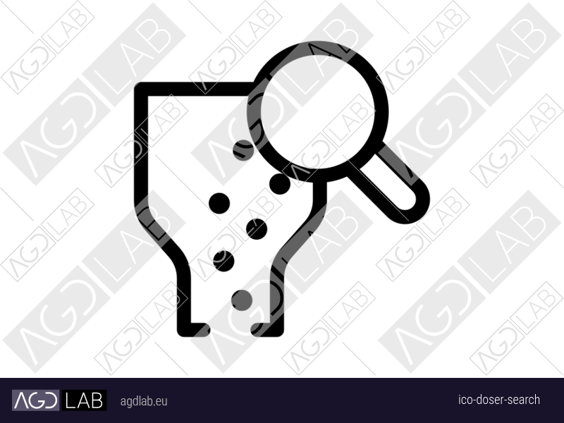 Icon with dosing or dispenser funnel symbol and magnifying glass. Used in material dosing, dispensing control systems and precision measurement applications. Represents finding items, filtering results, zoom features, quality inspection tools, parameter search functions, diagnostic options, or querying database information. Used in material dosing, dispensing control systems and precision measurement applications.