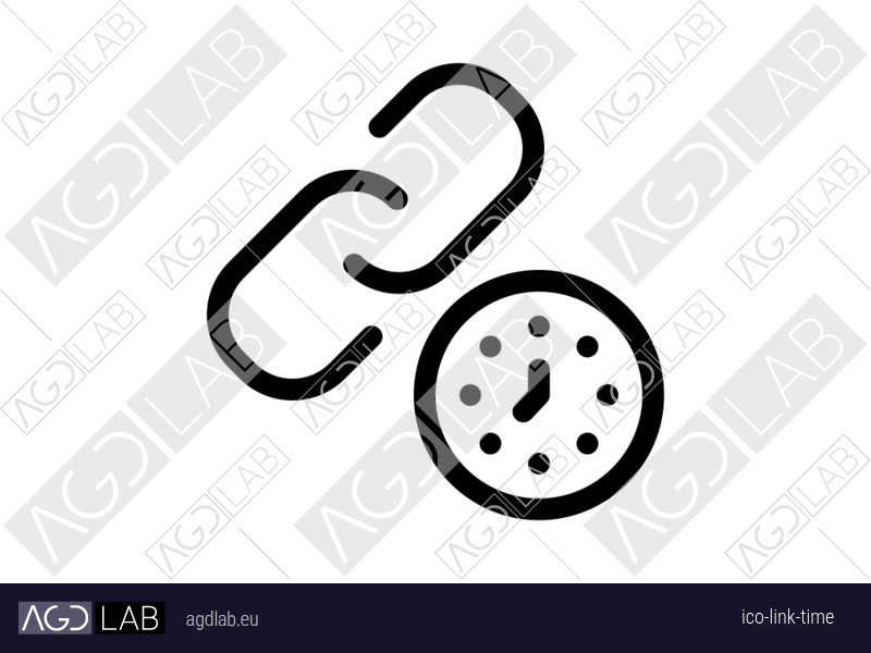 Icon with diagonal chain symbol and clock or time display. Used in hyperlink management, connection tracking, automated processes, sharing content and relationship mapping systems. Used in scheduling, chronological operation, time tracking, duration controls, real-time display, and temporal management systems. Used in hyperlink management, connection tracking, automated processes, sharing content and relationship mapping systems.