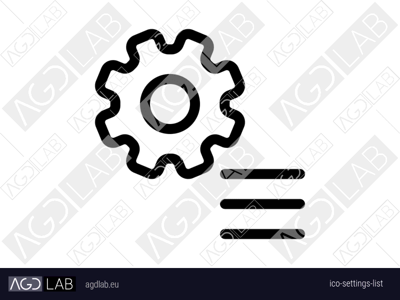 Icon with gear or cog wheel icon and group of 3 horizontal lines. Used in settings management, adjustment, customization, preferences, options, system configuration and process control interfaces. Shows item listings, menu options, additional information, or content organization. Used in settings management, preferences, options, system configuration and process control interfaces.