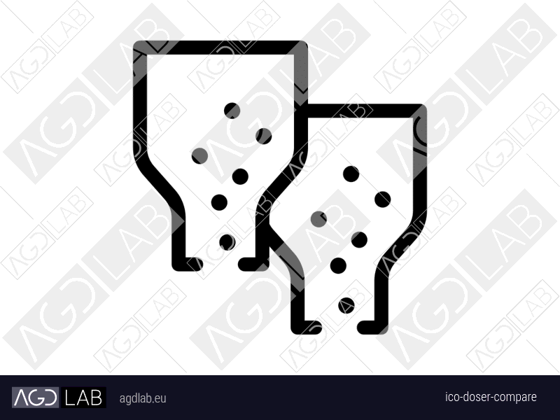 Icon with dosing or dispenser funnel symbol and two related elements. Used in material dosing, dispensing control systems and precision measurement applications. Represents comparing specifications, features, or dimensions between multiple items, showing differences, or duplicate detection. Used in material dosing, dispensing control systems and precision measurement applications.