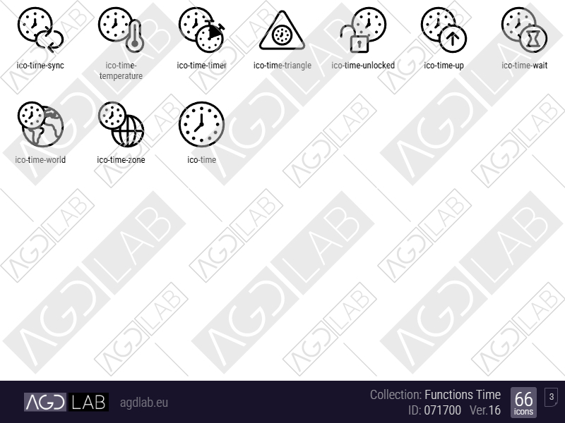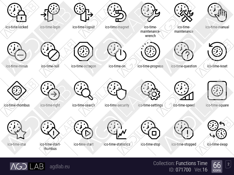 This collection contains 66 icons and represents clock elements including time functions, locks, global time, favorites, scheduling features, time zones and synchronization tools. Used in scheduling, chronological operation, time tracking, duration controls, real-time display, and temporal management systems.