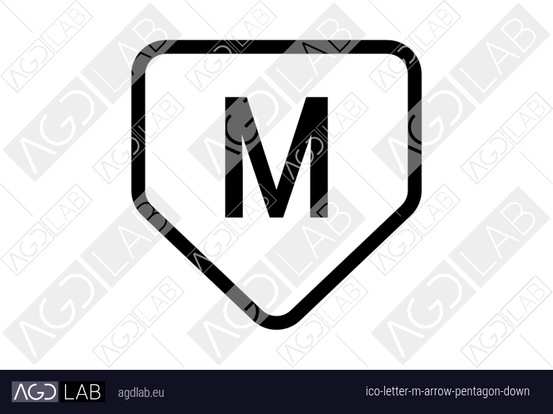Icon with letter M and arrow and pentagon, figure with five straight sides and downward arrow. Represents thirteenth item. Indicates downloading, saving content, lowering values, or moving elements down. Used in stepped navigation systems, directional indicators and ordered process flows requiring numbered or lettered pointing down directions.