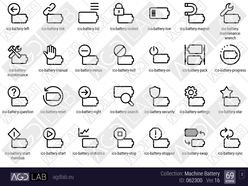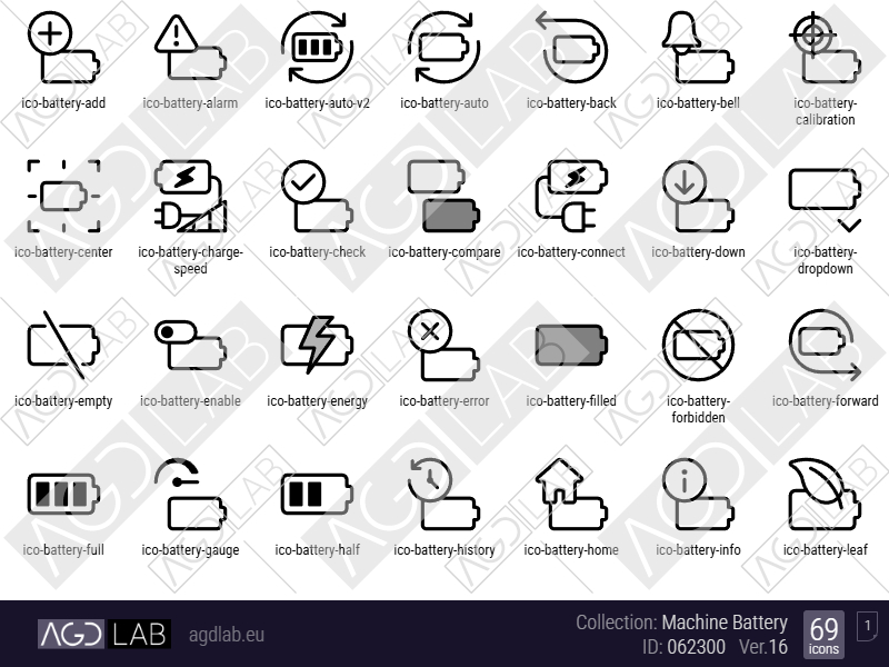 This collection contains 69 icons and shows battery operations including alerts, temperature, charging states, power levels, locks, eco mode, synchronization features and health indicators with battery outline style. Used in battery monitoring, power management and charging control interfaces.
