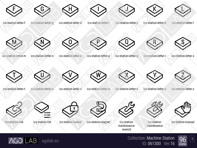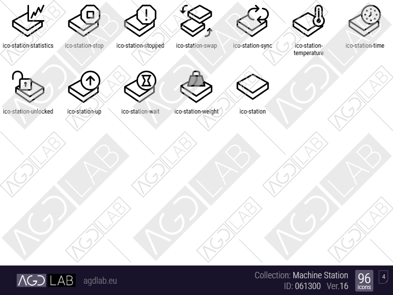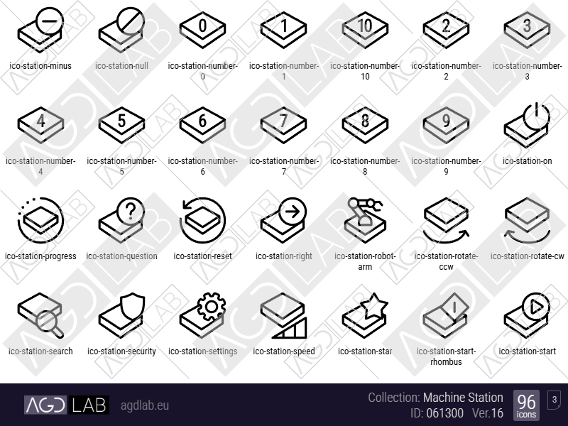 This collection contains 96 icons and shows station controls including interactions, statistics, rotation, timing, tool operations, equipment handling, settings indicators and validation states with consistent platform style. Contains letters and numbers. Used in station/surface monitoring, process control and equipment management interfaces.