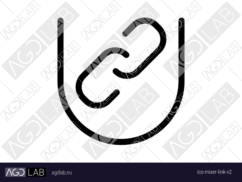 Icon with circular element (which represents the mixing blade or impeller) inside an U-shaped container or vessel and diagonal chain symbol and . Used in hyperlink management, connection tracking, automated processes, sharing content and relationship mapping systems. Used in industrial mixing, blending control and process automation systems.