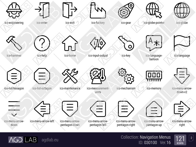 This collection contains 121 icons and displays interface menu elements including chat bubbles, grid layouts, assistant/wizard tools, sliders, charts, system controls, development tools, content management icons, integration elements, process flow tools and server monitoring visuals for system navigation and functionality. Used in application menu systems, control panels, admin dashboards, developer portals, and content management systems.