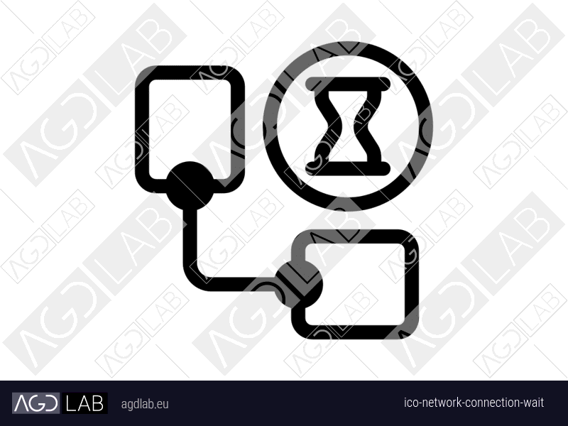 Icon with connected nodes or computer network diagram and connected plug symbols and hourglass symbol. Used for network topology, device connections, or communication pathway visualization. Indicates active network/charging connection, energy transfer, power status, correct data transfer, or successful linking. Shows loading states, standby mode,process duration, or wait periods. Used in network monitoring, connection management and system status interfaces.