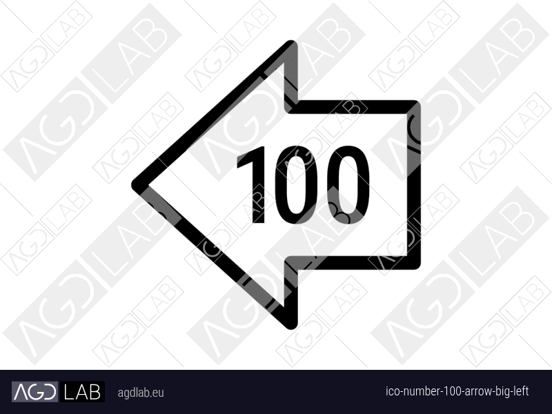 Icon with number 100 and arrow and big, huge, large and left-pointing arrow. Indicates hundredth value or percentage. Indicates leftward movement, previous items, or backward navigation. Used in stepped navigation systems, directional indicators and ordered process flows requiring numbered or lettered pointing left directions.