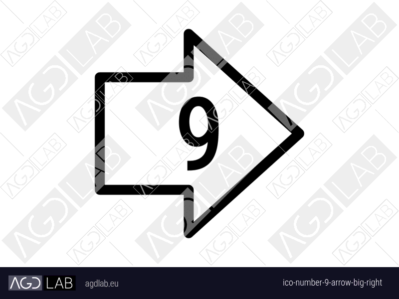 Icon with number 9 and arrow and big, huge, large and right-pointing arrow. Represents ninth value or multiple items. Indicates forward movement, next items, or rightward navigation. Used in stepped navigation systems, directional indicators and ordered process flows requiring numbered or lettered pointing right directions.
