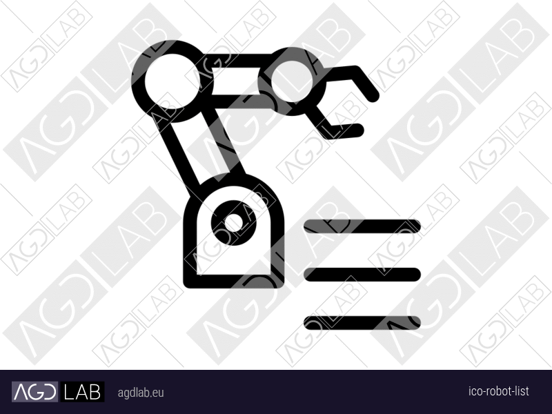 Icon with industrial robotic arm or mechanical manipulator and group of 3 horizontal lines. Used in robotic automation control systems, manufacturing process management and equipment coordination interfaces. Shows item listings, menu options, additional information, or content organization. Used in robotic automation control systems, manufacturing process management and equipment coordination interfaces.