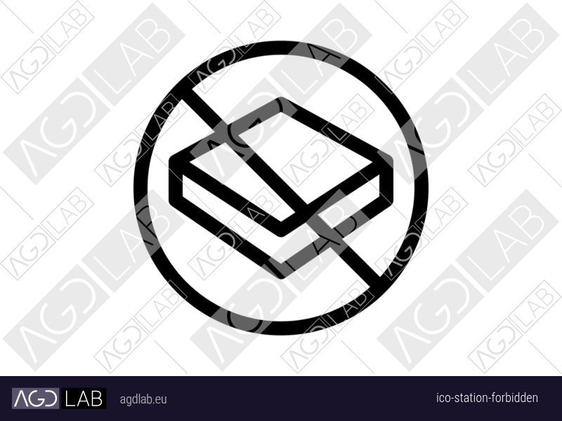 Icon with isometric view of a flat, slightly elevated plane or surface and crossed-out circle or prohibition symbol. Used in station/surface monitoring, process control and equipment management interfaces. Indicates restricted access, unavailable features, or prohibited actions. Used in station/surface monitoring, process control and equipment management interfaces.