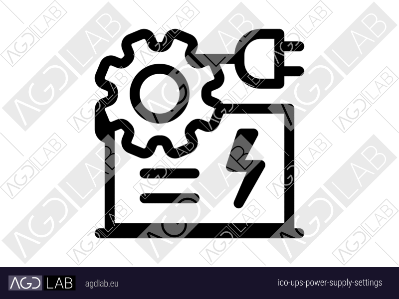 Icon with UPS (Uninterruptible Power Supply) battery backup with power plug and energy symbol and power, energy and supply and gear or cog wheel icon. Represents backup power systems that provide emergency power when the main power source fails, ensuring continuous operation of critical systems. Used in settings management, adjustment, customization, preferences, options, system configuration and process control interfaces. Used in energy management, power distribution, electrical connectivity and consumption monitoring interfaces.