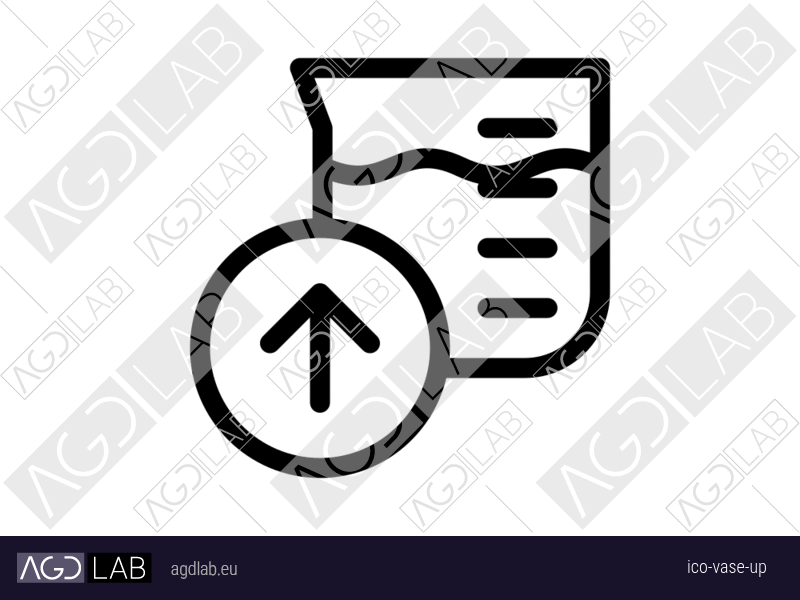 Icon with water or chemical transparent container with measurements and upward arrow. Indicates uploading content, increasing values, or upward movement. Used in volume measurement, fluid monitoring and capacity control systems.