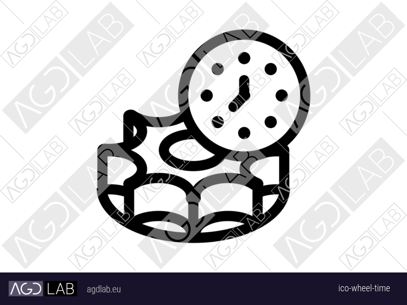 Icon with circular gear-like wheel or starwheel and clock or time display. Used in wheel control, rotation management, guiding and transporting bottles on conveyor systems and mechanical interfaces. Used in scheduling, chronological operation, time tracking, duration controls, real-time display, and temporal management systems. Used in wheel control, rotation management, guiding and transporting bottles on conveyor systems and mechanical interfaces.