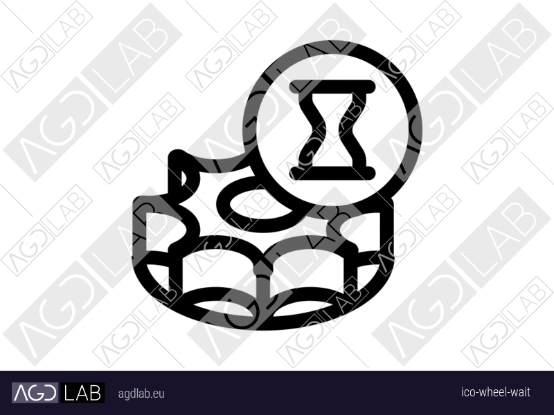 Icon with circular gear-like wheel or starwheel and hourglass symbol. Used in wheel control, rotation management, guiding and transporting bottles on conveyor systems and mechanical interfaces. Shows loading states, standby mode,process duration, or wait periods. Used in wheel control, rotation management, guiding and transporting bottles on conveyor systems and mechanical interfaces.